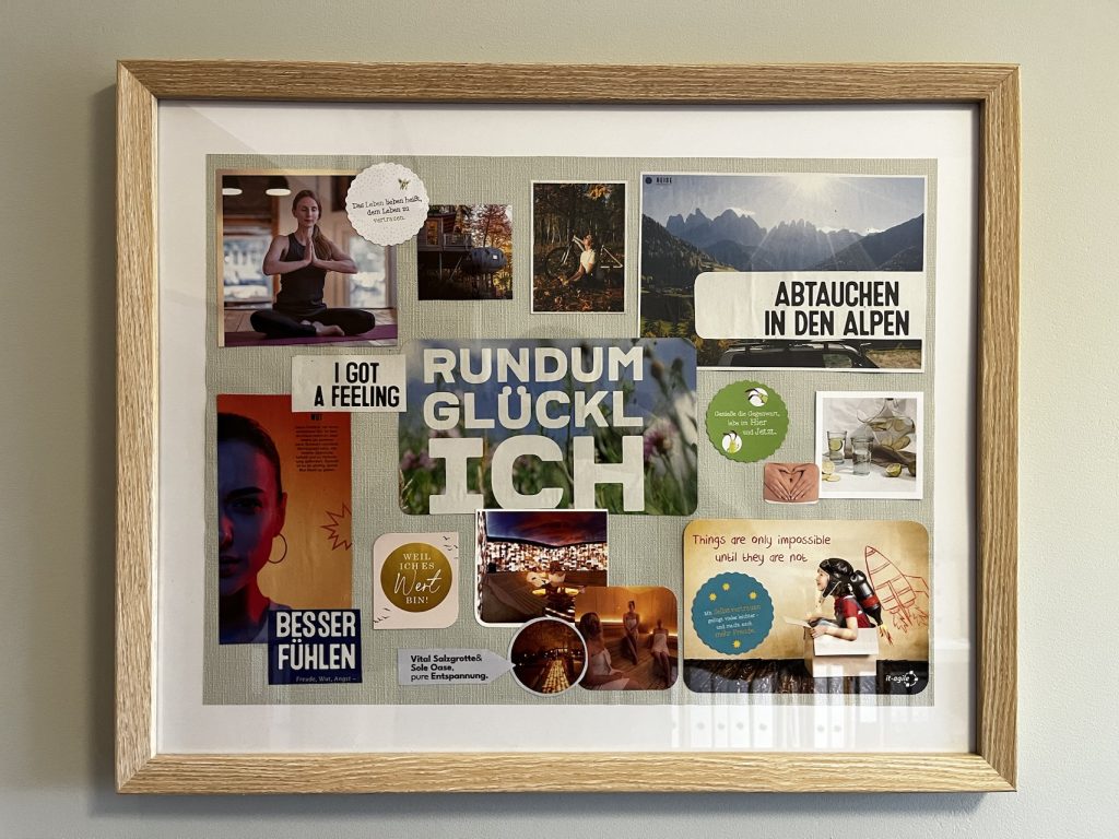 5. Jetzt bist du gut vorbereitet. Erstelle auf Grundlage dieser Antworten ein Visionboard für das neue Jahr. Du kannst dir dafür ein großes Stück Pappe/Tapetenrest besorgen und eine Collage aus Bildern, Skizzen, Sprüchen, Farben und Affirmationen erstellen. Schneide und klebe alles auf, was du dir in deinem Leben wünschst. Es gibt hierbei kein richtig oder falsch. Lass deiner Kreativität freien Lauf. (Hinweis: Natürlich kannst du dies auch digital tun.) Bilder und Sprüche kann man super aus alten (kostenlosen) Zeitschriften ausschneiden.